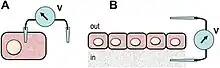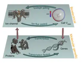 Endogenous bioelectric signals are produced in cells by the cumulative action of ion channels, pumps, and transporters. In non-excitable cells, the resting potential across the plasma membrane (Vmem) of individual cells propagate across distances via electrical synapses known as gap junctions (conductors), which allow cells to share their resting potential with neighbors. Aligned and stacked cells (such as in epithelia) generate transepithelial potentials (such as batteries in series) and electric fields, which likewise propagate across tissues.[13] Tight junctions (resistors) efficiently mitigate the paracellular ion diffusion and leakage, precluding the voltage short circuit. Together, these voltages and electric fields form rich and dynamic and patterns inside living bodies that demarcate anatomical features, thus acting like blueprints for gene expression and morphogenesis in some instances. More than correlations, these bioelectrical distributions are dynamic, evolving with time and with the microenvironment and even long-distant conditions to serve as instructive influences over cell behavior and large-scale patterning during embryogenesis, regeneration, and cancer suppression.[3][14][8][15][16] Bioelectric control mechanisms are an important emerging target for advances in regenerative medicine, birth defects, cancer, and synthetic bioengineering.[17][18]