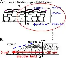Electric potential difference across corneal epithelium, and the generation of wound electric fields.[7]