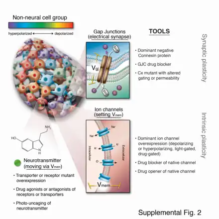 Tools for manipulating non-neural bioelectricity include pharmacological and genetic reagents to alter cell connectivity (control gap junctions), cell Vmem (control ion channels/pumps), and bioelectrically guided 2nd messengers (control neurotransmitters and other small molecules).[69]