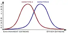 The norm of reaction, or reaction norm, is a pattern of phenotypic plasticity that describes how a single genotype can produce an array of different phenotypes in response to different environmental conditions.[37] Furthermore, a reaction norm can be a graphical representation of organismal variation in phenotype in response to numerous environmental circumstances. The graphical representation of reaction norms is commonly parabolic in shape, which represents the variation in plasticity across a population.[38] Additionally, reaction norms allow organisms to evaluate the need for various phenotypes in response to the magnitude of the environmental signal.[37]