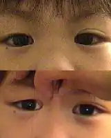 Two images of the same child. The top image shows the left eye slightly cross-eyed. This is fixed in the bottom picture by stretching the extra skin around the eye.