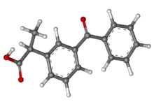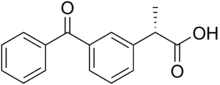Dexketoprofen is the (S)-enantiomer of ketoprofen. Technically it is a chiral switch of (±)-ketoprofen. The switch was done for a faster onset of action, a better therapeutic value.[3] Dexketoprofen consists of a propionic acid moiety connected to a benzophenone molecule by its second carbon.