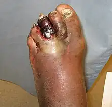 Diabetic foot infection is any infection of the foot in a diabetic person.[2] The most frequent cause of hospitalization for diabetic patients is due to foot infections.[3] Symptoms may include pus from a wound, redness, swelling, pain, warmth, tachycardia, or tachypnea.[4] Complications can include infection of the bone, tissue death, amputation, or sepsis.[2] They are common and occur equally frequently in males and females. Older people are more commonly affected.