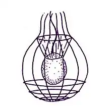 Diaphanoeca grandis has a large lorica, or protective outer covering, that surrounds the cell. It is an oval shape with a narrow neck, and when it is dried out it becomes conical. The lorica is usually around 30 μm long from its base to the rib-like strands (costae) which stick out from the front.[4] At its greatest diameter, it is 20 μm long.[5] The inner chamber of the lorica is surrounded by two layers of costae. The outer layer is made of around twelve costae which wrap around the circumference of the chamber, each of which is made of eight strips, two of which stick out from the front. The inner layer is made of two or three costae which stretch down the length of the lorica, perpendicular to the outer costae. These lengthwise costae are made of strips equal in number to how many outer widthwise costae there are (typically twelve). The front most of the lengthwise costae is tight and constricted, appearing to have two strands. All of the strips of the lengthwise costae are roughly the same length, and they are only attached to the outer costae by one end. The costae consistently overlap in a rising counterclockwise manner (sinistrorse), but they overlap more towards the front.[4] Slender, fiber-like structures (called "roots") are woven into a delicate mesh which stretches between the lengthwise and widthwise costae. The mesh bridges most of the open space between the costae, but its function is unknown.[4] The mesh is made up of tiny 0.01 μm wide filaments, with pores between 0.05 and 0.5 μm in size.[3] However, the mesh can only be seen under certain conditions, and during preparation for scanning electron microscope observation it appears to shrink, changing the shape of the lorica.[5]