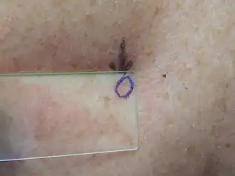 Diascopy is a test for blanchability performed by applying pressure with a finger or glass slide and observing color changes.[2][3][4][5]