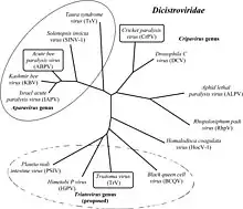 Dicistroviridae is a family of viruses in the order Picornavirales. Invertebrates, including aphids, leafhoppers, flies, bees, ants, and silkworms, serve as natural hosts. There are 15 species in this family, assigned to three genera.[1][2] Diseases associated with this family include: DCV: increased reproductive potential. extremely pathogenic when injected with high associated mortality. CrPV: paralysis and death.[2][3]