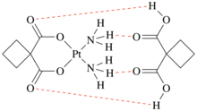 Dicycloplatin consists of carboplatin and cyclobutane-1,1-dicarboxylic acid (CBDC) linked by the hydrogen bond. In the structure of dicycloplatin, there are two types of bond: O-H...O is the bond between the hydroxyl group of CBDC with carboxyl oxygen atom. It creates the one-dimensional polymer chain of carboplatin and CBDC. The second one is N-H...O which links between the ammonia group of carboplatin and oxygen of CBDC. It forms the two-dimensional polymer chain of carboplatin and CBDC. In aqueous solution, the 2D-hydrogen bonded polymeric structure of dicycloplatin is destroyed. Firstly, the bond between ammonia group of carboplatin and oxygen of CBDC breaks, thus inducing the formation of one-dimensional dicycloplatin. After that, the strong hydrogen bond breaks and creates an intermediate state of dicycloplatin. Finally, the rearrangement of different orientation of carboplatin and CBDC leads to the formation of intramolecular hydrogen bond and a supramolecule of dicycloplatin with two O-H...O and N-H...O is created.[5]