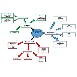 - ↑ Hariri, Niloofar; Thibault, Louise (2010). "High-fat diet-induced obesity in animal models". Nutrition Research Reviews. 23 (2): 270–99. doi:10.1017/S0954422410000168. PMID 20977819.