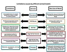 Obesity is affected by "environmental, biological, and psychosocial pressures",[18] therefore it is understandable that several limitations are established when translating results between the results of a diet induced obesity model in a lab and humans. While models are an important method of investigating the influences of obesity and drug testing, it is important to understand the limits of the model's overall ability to resemble the human obesogenic pathophysiology.[19] Such limitations can be divided into three broad categories—biological, dietary and experimental differences—factors including, but not limited to, the genetic makeup of the species or strain, the environment in which the specimen is held (temperature, light, number of animals), age, sex, the duration of the experiment, and the texture or type of rations fed to the animals.[3]