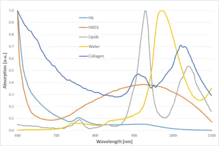 Blood strongly absorbs in the red spectral range, whereas collagen, water and lipids have their absorption peaks at wavelengths longer than 900 nm. The distinction between oxy and deoxy-haemoglobin is due to the presence of a second large peak in the case of oxy-haemoglobin. Lipids are characterized by absorption maxima at 930 nm and 1040 nm, while the wavelength 975 nm is sensitive to water. Finally, an absorption peak for collagen takes place at 1030 nm.[16][1]