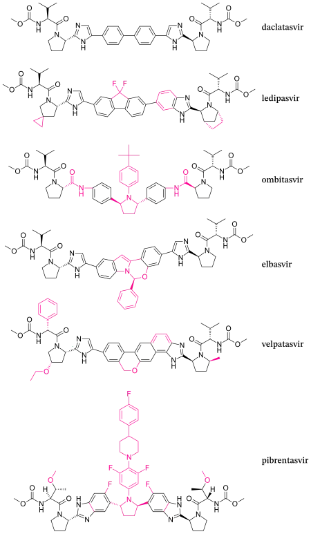 Nonstructural protein 5A (NS5A) inhibitors are direct acting antiviral agents (DAAs) that target viral proteins, and their development was a culmination of increased understanding of the viral life cycle combined with advances in drug discovery technology.[1][2] However, their mechanism of action is complex and not fully understood.[2] NS5A inhibitors were the focus of much attention when they emerged as a part of the first curative treatment for hepatitis C virus (HCV) infections in 2014.[3] Favorable characteristics have been introduced through varied structural changes, and structural similarities between NS5A inhibitors that are clinically approved are readily apparent.[4][5] Despite the recent introduction of numerous new antiviral drugs, resistance is still a concern and these inhibitors are therefore always used in combination with other drugs.[6][7]