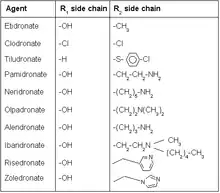 Increased carbon length of the nitrogen R2 side chain alters activity. Side chain that is made out of three carbons has proven to be the most ideal length in terms of activity, increasing or decreasing the length of the chain from there has negative effect on biological activity. Alendronate, a common bisphosphonate drug, has a three carbon length side chain for example.[17] Risedronate has heterocyclic structure containing nitrogen. Heterocyclic nitrogen containing bisphosphonates have revealed better results in terms of activity compared to earlier bisphosphonates with nitrogen bound to carbon chain. Studies on risedronate analogous with different placement of nitrogen on the ring have shown no measurable difference on biological activity. Increased length of carbon chain connected to the ring revealed negative results.[18] Zoledronate is the most potent bisphosphonate drug today only available as intravenous injection. It is the only bisphosphonate drug that has two nitrogen groups in the side chain hence its potency and route of administration differs from other drugs in the same class.[16]