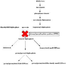 Bisphosphonates with a more lipophilic character have been developed and have shown potential as a tumor suppressant. They operate by a slightly different mechanism in which they not only inhibit the key enzyme farnesyl pyrophosphate synthase (FPPS) of the mevalonate pathway but also geranylgeranyl pyrophosphate synthase (GGPS), an enzyme also located in the mevalonate pathway. They do not have the same affinity for the bone minerals.[4]