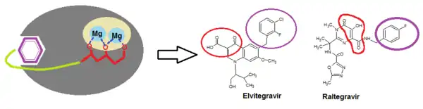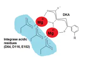 Since critical structure information is scarce on HIV integrase catalysis it is difficult to find the exact pharmacophore for its inhibition. Wang et al (2010) hoped that by studying the SAR and pharmacophore of a dual inhibitor scaffold, focusing both on integrase and reverse transcriptase (RT) it would be possible to observe anti-integrase activity. By studying the SAR of HIV integrase inhibitors it was possible to find that for optimal integrase inhibition the pharmacophore requires a regiospecific (N-1) DKA of a specific length. A DKA functionality or its heterocyclic bioisostere that selectively inhibit strand transfer seem to be present in all major chemotypes of integrase inhibitors.[17] As detailed in the SAR discussion above the two necessary structural components of INI are a benzyl hydrophobic moiety and a chelating triad to bind the Mg2+ ions. For the triad to bind the Mg2+ ions has to be ionized (see fig. 5) and thus a pharmacophore bioisostere has to be ionized too and the benzyl pharmacophore bioisostere must to be very hydrophobic.[11][17]