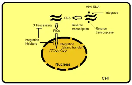 There are several ways to target integrase but strand transfer inhibition is the most intuitively obvious and readily pursued to date. Other targets include, for example, the protein domains beyond the active site of IN. The domains interact with viral or host DNA and are important for binding to the enzyme. It is possible to hamper functions of the enzyme by disrupting or removing these bindings. PIC is a multimeric protein structure inside the host cell, composed of both viral and host proteins. Integrase is a part of PIC's viral component. PIC's viral and host proteins are believed to modulate intrinsic activity of the enzyme, shuttle PIC to the nucleus and direct integration of viral DNA into a transcriptionally active region of the host genome. If it were possible to exclude certain proteins from the PIC it would block the ability of the virus to integrate into the host genome. The process where the retroviral RNA is transcribed to DNA and then integrated into the host cell's genome is shown in figure 2.[8]