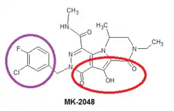 Since there have been problems with resistance to raltegravir and elvitegravir, scientists have started to work on new second generation integrase inhibitors, such as MK-2048 which in 2009 was developed by Merck. It's a prototype second generation INSTI that remains potent against viruses containing mutations against raltegravir and elvitegravir. The mechanism of action and SAR of MK-2048 is the same as of the other INSTIs, the structure of MK-2048 shown in figure 6 with essential pharmacophore highlighted.[23][24]