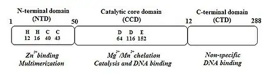 3. The C-terminal domain (CTD), which encompasses amino acids 213–288, binds DNA nonspecifically and its interaction with NTD and CCD is required for IN 3´-processing and strand-transfer activities.[11][12] CTD is the least conserved of the three domains.[12] IN acts as a multimer and dimerization is required for the 3´-processing step, with tetrameric IN catalyzing the strand-transfer reaction.