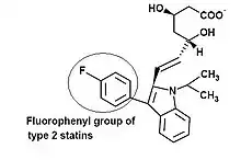 Type 2 statins Statins that are fully synthetic and have larger groups linked to the HMG-like moiety are often referred to as type 2 statins. One of the main differences between the type 1 and type 2 statins is the replacement of the butyryl group of type 1 statins by the fluorophenyl group of type 2 statins. This group is responsible for additional polar interactions that causes tighter binding to the HMGR enzyme. Statins that belong to this group are:[9]