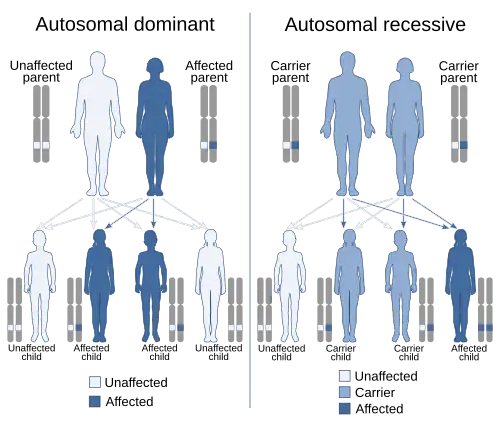 Dominance is the phenomenon of one variant (allele) of a gene on a chromosome mask or overrides the effect of a different variant of the same gene on the other copy of the chromosome.[1][2] The first variant is termed dominant and the second is called recessive. This state of having two different variants of the same gene on each chromosome is originally caused by a mutation in one of the genes, either new (de novo) or inherited. The terms autosomal dominant or autosomal recessive are used to describe gene variants on non-sex chromosomes (autosomes) and their associated traits, while variants on sex chromosomes (allosomes) are termed X-linked dominant, X-linked recessive or Y-linked; these have an inheritance and presentation pattern that depends on the sex of both the parent and the child (see Sex linkage). Since there is only one copy of the Y chromosome, Y-linked traits cannot be dominant or recessive.[3] Additionally, there are other forms of dominance, such as incomplete dominance, in which a gene variant has a partial effect compared to when it is present on both chromosomes, and co-dominance, in which different variants on each chromosome both show their associated traits.