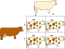This Punnett square shows co-dominance. In this example a white bull (WW) mates with a red cow (RR), and their offspring exhibit co-dominance expressing both white and red hairs.