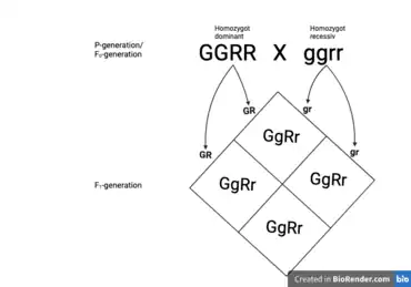 Dihybrid cross between homozygote dominant (GGRR) and homozygote recessive (ggrr) always resulting in heterozygotes (GgRr) with phenotype associated with the dominant alleles G and R.
