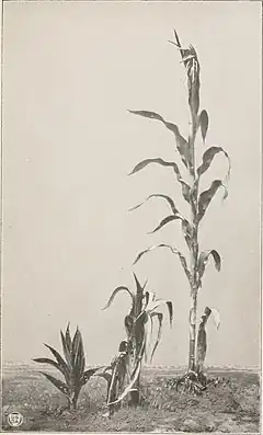 Inheritance of dwarfing in maize. Demonstrating the heights of plants from the two parent variations and their F1 heterozygous hybrid (centre)