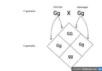 Monohybrid cross between heterozygotes (Gg), resulting in genptypical ratio 1:2:1 (GG:Gg:gg) and phenotypical ratio 3:1 (G:g).
