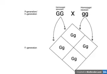 Monohybrid cross between homozygote dominant (GG) and homozygote recessive (gg), always resulting in heterozygote genotype (Gg) and the phenotype associated with the dominant allele, in this case capital G.