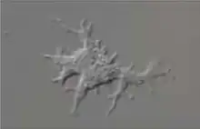In particular, D. jomungandri exhibits long, tapering thin ramose pseudopodia from all sides of the main cell body when attached to the surface of a culture flask. In this state, its length ranges from 33 to 87 μm long, with a mean length of 57.6 μm, and its width ranges from 3 to 12 μm, with a mean cell body width of 6.2 μm. Its pseudopodia are composed of hyaloplasm while the main body of the cell is made of granuloplasm. It does not form uroids, traces left by some amoebae during locomotion. No cysts have been observed from this species. Upon starvation, it will shrivel up and detach from the surface, and can remain suspended in the water column or float to the water surface.[1]