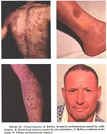 Examples of drug eruptions. (A) Bullous dermatitis caused by sulfathiazole (B) Fixed drug eruption caused by phenolphtalein (C) Bullous erythema multiforme (D) Diffuse photosensitivity reaction.