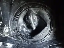 Before truly watertight zippers were invented, other methods of keeping the suit waterproof at the entry point were used, with the most common being a long rubber tunnel entry on the chest or the back, which would be folded shut, then rolled together from the sides and finally folded and clamped with a metal clip or tied with surgical rubber tubing. Sometimes the entry tunnel protruded through a non-watertight zipper, which would be closed over it to hold the roll in place in the pocket so formed.[1]:14