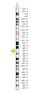 The TCIRG1 gene is present in chromosome locus 11q13, which encodes for the a3 subunit of vacuolar H+ ATPase (V-ATPase) that is unique to osteoclasts.[12] The a3 subunit is responsible in anchoring the vacuolar proton pump to the ruffled membrane of osteoclasts.[9] The V-ATPase is important in mediating the transport of hydrogen ions into the resorption lacunae, which is a pit on the bone surface enclosed by the osteoclast for bone resorption. The accumulation of ions in the lacuna facilitates the decomposition of hydroxyapatite crystals by creating an acidic environment, resulting in bone resorption.[12]