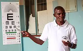 The chart contains rows of the letter "E" in various kinds of rotation. The patient is asked to state (usually by pointing) where the limbs of the E are pointing, "up, down, left or right." Depending on how far the patient can "read", his or her visual acuity is quantified. It works on the same principle as Snellen's distant vision chart.