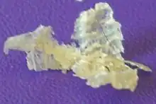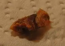 There are two genetically-determined types of earwax: the wet type, which is dominant, and the dry type, which is recessive. This distinction is caused by a single base change in the "ATP-binding cassette C11 gene". Dry-type individuals are homozygous for adenine (AA) whereas wet-type requires at least one guanine (AG or GG).[6] Dry earwax is gray or tan and brittle, and is about 20% lipid.[5] It has a smaller concentration of lipid and pigment granules than wet earwax.[5] Wet earwax is light brown or dark brown and has a viscous and sticky consistency, and is about 50% lipid.[5] Wet-type earwax is associated with armpit odor, which is increased by sweat production.[6][7]