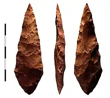 Bifacial silcrete point of early Homo sapiens, from M1 phase (71,000 BCE) layer of Blombos Cave, South Africa