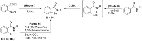 - ↑ Balkrishna SJ, Bhakuni BS, Chopra D, Kumar S (December 2010). "Cu-catalyzed efficient synthetic methodology for ebselen and related Se-N heterocycles". Organic Letters. 12 (23): 5394–7. doi:10.1021/ol102027j. PMID 21053969.