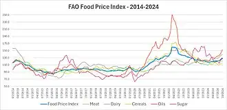 The World Economic Forum's Global Risks Report 2023 described food supply crises as an ongoing global risk.[132] The Russian invasion of Ukraine and crop failures from climate change worsened worldwide hunger and malnutrition.[133] Even Global North countries known for stable food supplies have been impacted.[134] Analysts described this inflation as the worst since the 2007–2008 world food price crisis.[111] However, in early 2024, the FAO reported a return to more moderate commodities market prices.[135][136] Moreover, the World Economic Forum's 2024 Global Risks Report showed significantly less concern from experts but the report still highlights a risk of the Israel–Hamas war and the return of El Niño.[137] Both of these events could disrupt supply chains again.[137]Financial markets