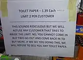 The pandemic has impacted the retail sector. Shopping centres around the world responded by reducing hours or closing down temporarily. As of 18 March 2020, the footfall to shopping centres fell by up to 30%, with significant impact in every continent.[166] Additionally, product demand exceeded supply for many consumables, resulting in empty retail shelves.[167][168] In Australia, the pandemic has provided a new opportunity for daigou shoppers to re-sell into the China market. "The virus crisis, while frightening, has a silver lining".[169][170]