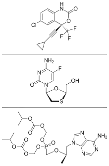 Efavirenz is a non-nucleoside reverse transcriptase inhibitor (NNRTI) of HIV-1. Emtricitabine is a nucleoside reverse transcriptase inhibitor (NRTI) of HIV-1. Tenofovir is a nucleotide reverse transcriptase inhibitor of HIV-1, and it can be classified as an NtRTI. These three drugs work in combination to target the HIV reverse transcriptase protein in three ways, which reduces the virus's capacity to mutate.[5]