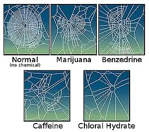 In 1948, Swiss pharmacologist Peter N. Witt started his research on the effect of drugs on spiders. The initial motivation for the study was a request from his colleague, zoologist H. M. Peters, to shift the time when garden spiders build their webs from between 2:00 a.m. and 5:00 a.m., which was decidedly inconvenient for Peters, to earlier hours.[13] Witt tested spiders with a range of psychoactive drugs, including amphetamine, mescaline, strychnine, LSD, and caffeine, and found that the drugs affect the size and shape of the web rather than the time when it is built. At small doses of caffeine (10 μg/spider), the webs were smaller; the radii were uneven, but the regularity of the circles was unaffected. At higher doses (100 μg/spider), the shape changed more, and the web design became irregular. All the drugs tested reduced web regularity except for small doses (0.1–0.3 μg) of LSD, which increased web regularity.[12]