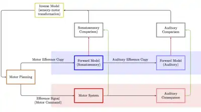 It has been argued that motor efference copies play an important role in speech production.[18] Tian and Poeppel propose that a motor efference copy is used to produce a forward model of somatosensory estimation, which entails an estimation of the articulatory movement and position of the articulators as a result of planned motor action.[19][18] A second (subsequent) auditory efference copy entails the estimation of auditory information as produced by the articulatory system in a second forward model. Both of these forward models can produce respective predictions and corollary discharge, which can in turn be used in comparisons with somatosensory and auditory feedback. Moreover, this system is thought by some to be the basis for inner speech, especially in relation to auditory verbal hallucinations.[20][21][22] In the case of inner speech, the efference signal is not sent or is inhibited before action takes place, leaving only the efference copy and leading to the perception of inner speech or inner hearing.[23] In the case of auditory verbal hallucinations, it is thought that a breakdown along the efference copy and forward model route creates a mismatch between what is expected and what is observed, leading to the experience that speech is not produced by oneself.[22][21] Recent studies suggest that efference copy already occurs when an acoustic signal is generated at the press of a button.[24] The differences in the ERP signal of the efference copy are so severe that machine learning algorithms can distinguish between schizophrenia patients and healthy control subjects, for example.[25] Efference copies also occur not only with spoken words, but with inner language - the quiet production of words.[26]