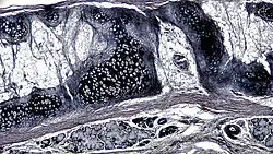 Elastic cartilage is histologically similar to hyaline cartilage but contains many yellow elastic fibers lying in a solid matrix. These fibers form bundles that appear dark under a microscope. The elastic fibers require special staining since when it is stained using haematoxylin and eosin (H&E) stain it appears the same as hyaline cartilage.[3] Verhoeff van Geison stains are used (giving the elastic fibers a black color), but aldehyde fuchsin stains, Weigert's elastic stains, and orcein stains also work.[3] These fibers give elastic cartilage great flexibility so that it is able to withstand repeated bending. Similarly to hyaline one or multiple chondrocytes lie between the spaces (or lacunea) in the fibres.[2] The chondrocytes only make up 2% of the tissue's volume.[2] Chondrocytes and the extracellular matrix are contained in an outerlayer named the perichondrium[2] (which is a layer of dense irregular connective tissue that surrounds cartilage which is independent of the joint).[3] It is found in the epiglottis (part of the larynx), and the pinnae (the external ear flaps of many mammals). Elastin fibers stain dark purple/black with Verhoeff's stain.