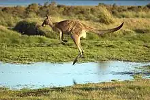 From previous experimental studies on large animals, it was noted that during active locomotion mammals save much of the energy they would otherwise need for running by means of elastic structures in their legs. Measurements been made of the rates of oxygen consumption of various animals, as they walked, ran or hopped, revealed that at high speeds animals seem to save more than a half the metabolic energy they would otherwise need for locomotion.[5] A notable example is jumping in kangaroos. When hopping at slow speeds, their uses of energy increase linearly, but at high speeds, kangaroos can move as cheaply (from an energetic perspective) as if they were moving at slower speeds.[6]