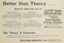 The instruments were widely advertised in popular magazines[4] and the company, Electrolibration, opened numerous offices far from their headquarters in Birmingham, Alabama including New York and London. The President of Electropoise, John N. Webb, admitting that he was not a man of science stated that his hands were full handling the business.[5] It was sold for about twenty-five dollars. Other successors like Oxydonor were sold at ten to thirty dollars.[6] Even during its heyday, a period when electricity was viewed with awe, some physicians called attention to the nature of the fraud but their efforts had little impact on the advertisement and sale. A letter to the editor of the Journal of the American Medical Association in 1897 by a physician named George N. Kreider states that "One of the most glaring frauds of this decade has been an appliance known as 'Electropoise,' advertised in Harper's Monthly and other leading publications" and promoted by a W.H. De Puy, editor of the New York Christian Advocate.[7][8]