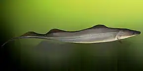 In vertebrates, passive electroreception is an ancestral trait, meaning that it was present in their last common ancestor.[27] The ancestral mechanism is called ampullary electroreception, from the name of the receptive organs involved, ampullae of Lorenzini. These evolved from the mechanical sensors of the lateral line, and exist in cartilaginous fishes (sharks, rays, and chimaeras), lungfishes, bichirs, coelacanths, sturgeons, paddlefishes, aquatic salamanders, and caecilians. Ampullae of Lorenzini appear to have been lost early in the evolution of bony fishes and tetrapods, though the evidence for absence in many groups is incomplete and unsatisfactory.[27] Where electroreception does occur in these groups, it has secondarily been acquired in evolution, using organs other than and not homologous with ampullae of Lorenzini.[8][27]