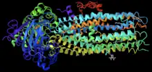 Ivacaftor is a selective small-molecule potentiator of the CFTR protein that increases the protein's ability to open chloride channels.[23][24] Its effectiveness is highly dependent on the amount of CFTR protein at the cell surface and the responsiveness of the mutant CFTR protein.[25] Ivacaftor's primary target is to treat class III CFTR gating mutations like G551D as well as other less common mutations.[24] In the crystalline figure is shown ivacaftor, displayed as a gray ball and stick model on the bottom-right, bound to CFTR docked in a cleft formed by transmembrane helices at the protein-lipid interface.[26]