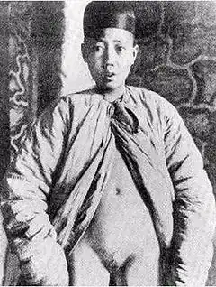 Emasculation was performed in China on men to create palace eunuchs for the imperial court.[19] The practice dates back to the Shang dynasty (1600–1046 BC)[20] and continued up until 1924,[21] when the eunuch system was abolished by the last emperor of China, Puyi.[22] The last living palace eunuch, Sun Yaoting, died in 1996.[23]