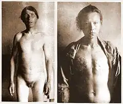 Originally, the emasculation procedure was performed by burning the testicles off with an iron.[44] Later, the genitals were tied at the base and removed using a knife or razor blade. The wound was then cauterised, or a salve was applied, to prevent bleeding. Many Skoptsy were peasants and were familiar with animal husbandry, which meant their emasculation procedures were often performed with "surgical precision."[45] In some instances, members of the Skoptsy would perform the emasculation on themselves, in an act of self-surgery, though it was more typical for the procedure to be performed by an elder during a ceremony.[36]