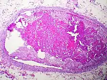 Embolism by other materials is rare. Septic embolism happens when a purulent tissue (pus-containing tissue) is dislodged from its original focus. Tissue embolism is a near-equivalent to cancer metastasis, which happens when cancer tissue infiltrates blood vessels, and small fragments of them are released into the blood stream. Foreign-body embolism happens when exogenous—and only exogenous—materials such as talc enter the blood stream and cause occlusion or obstruction of blood circulation. Bullet embolism occurs in approximately 0.3% cases of gunshot wounds.[8] Amniotic-fluid embolism is a rare complication of childbirth.