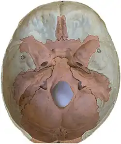 In humans and other mammals, the endocranium forms during fetal development as a cartilaginous neurocranium, that ossifies from several centers.[3] Several of these bones merge, and in the adult primates (including humans), the endocranium is composed of only five bony elements (from front to back):[4]